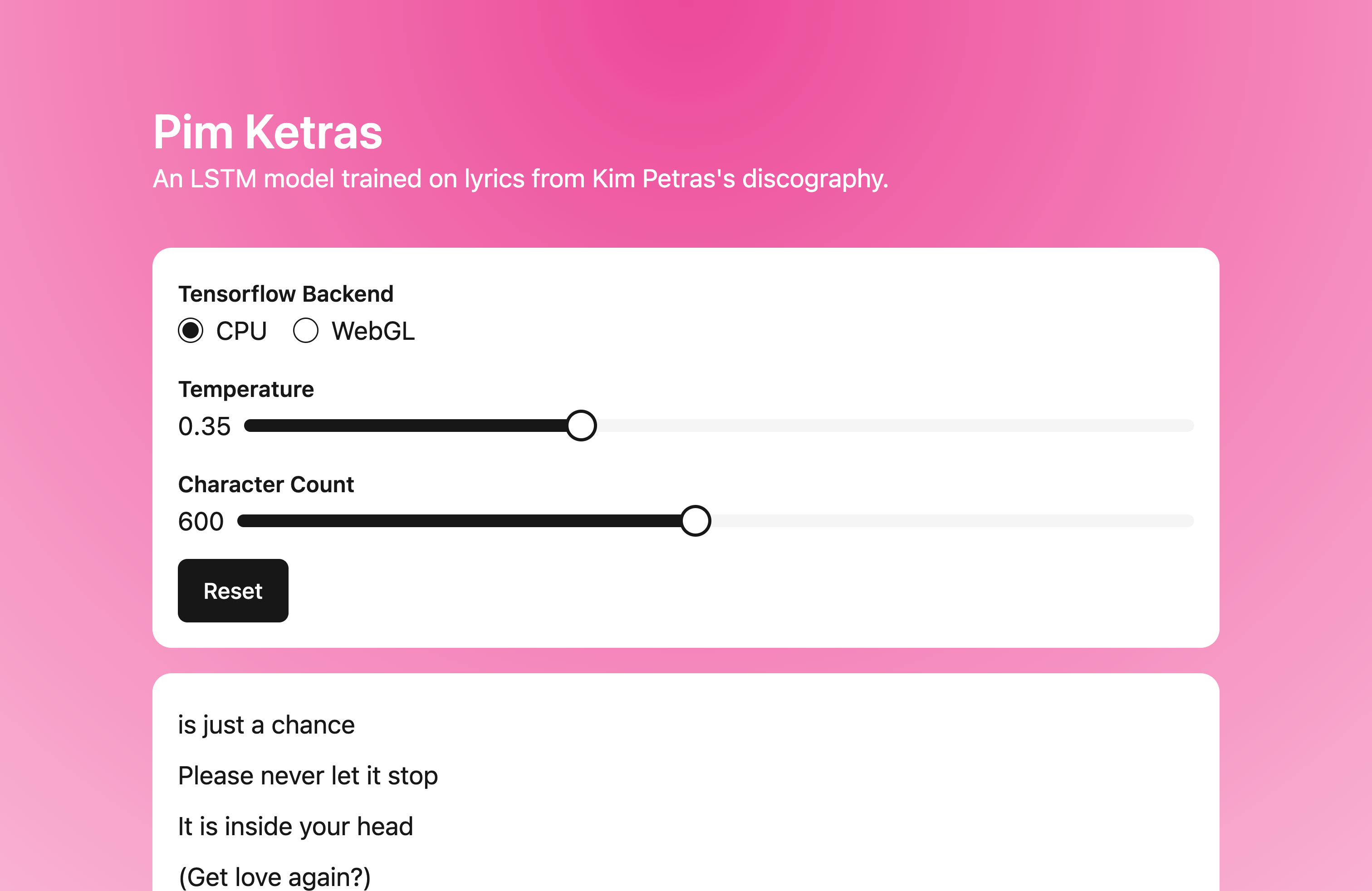 Pim Ketras is a machine learning experiment that generates text based on a corpus of lyrics from Kim Petras's discography. It is Long Short-Term Memory (LSTM) neural network that was trained using TensorFlow.js. The website was built using React.